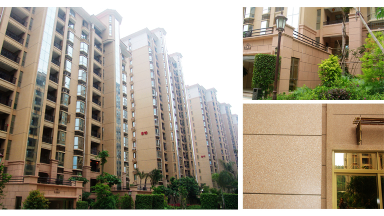 花崗巖漆(真石巖片漆)顏色是純天然彩砂、巖片構(gòu)成、色澤自然、仿石紋清晰逼真、極富質(zhì)感,主要應用高檔住宅小區(qū)外墻涂裝。